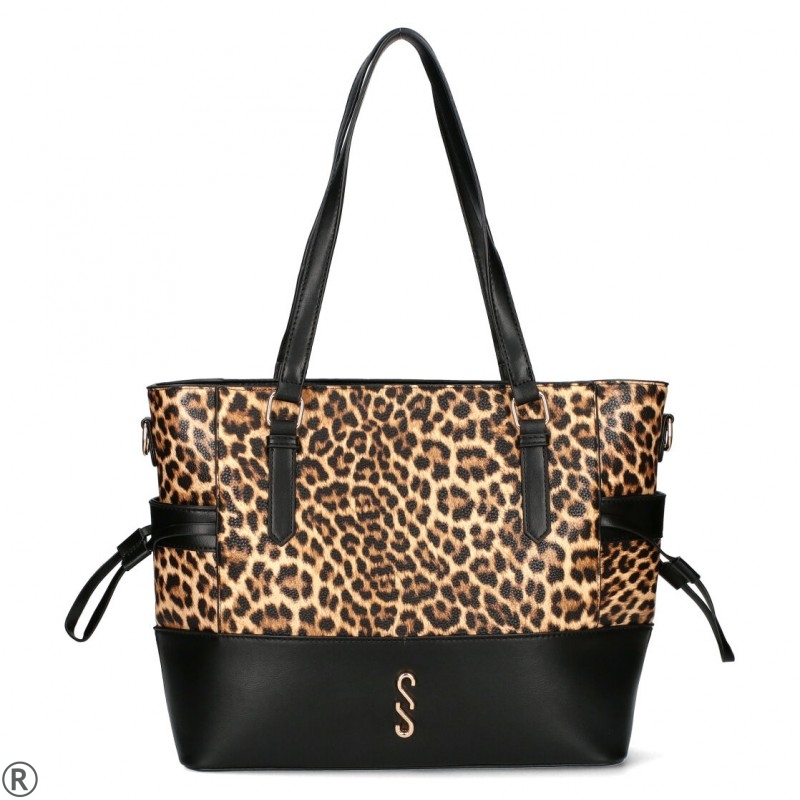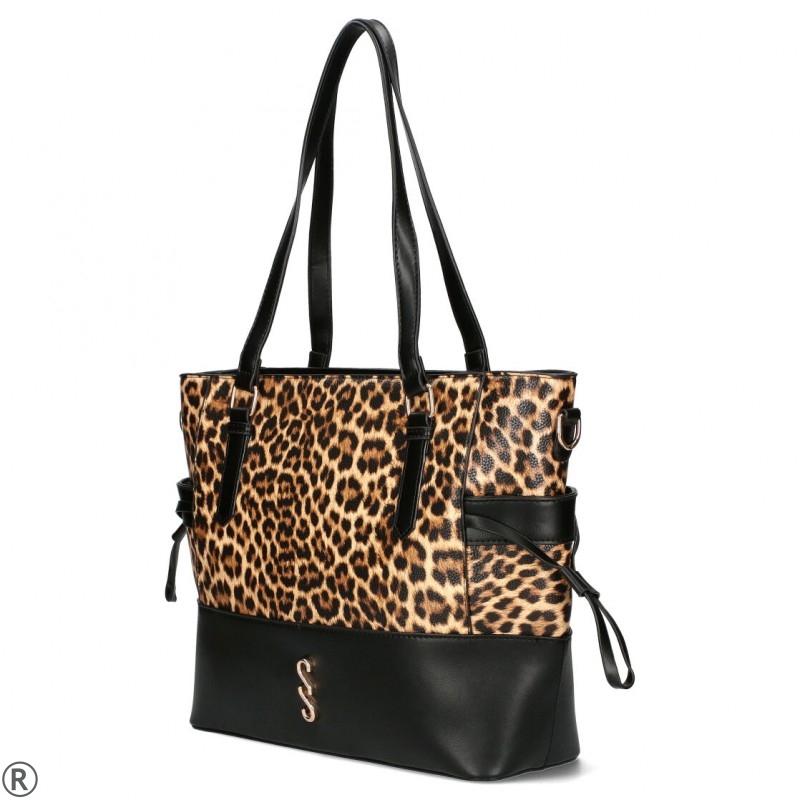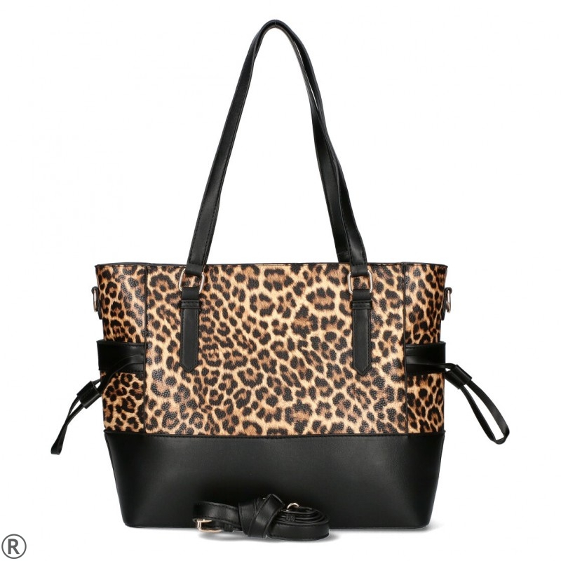 Голяма твърда чанта с леопардов принт, едно голямо отделение с джоб за телефон и два малки.